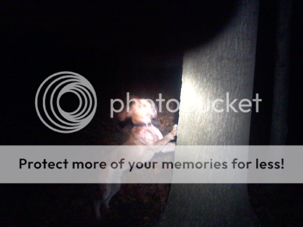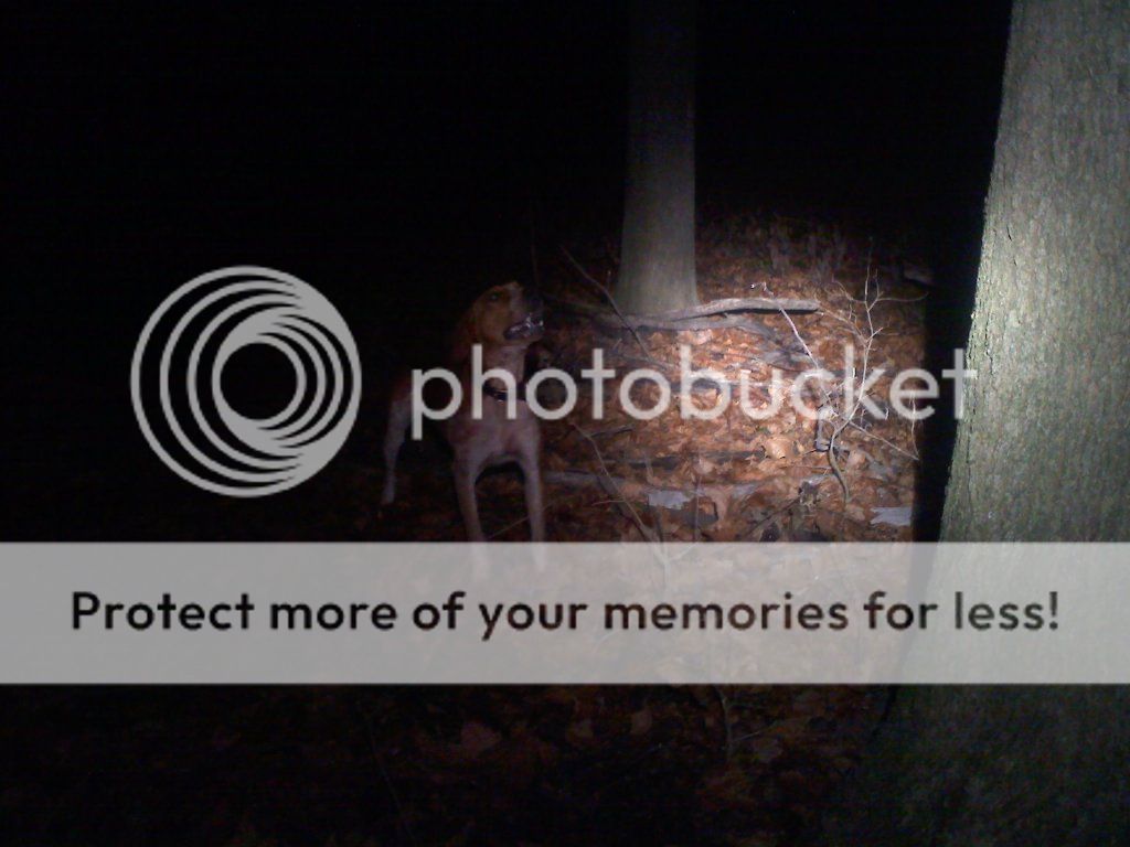 Here is a picture of Jasper tonight. He is wore down a little because we have been hitting it pretty hard since midnight friday. He has been doing a good job. He has split, backed and missed all so far. He got fooled twice saturday night but it was his first hunt on the river but he also didnt back my buddies dog when she was slick and went on to finish with the meat. He has missed a couple times but he is naturally straight because last night in the last woods we made three trees in a smaller woods and when we were walking out there were two does standing right in the edge of the woods and the dogs had to go right by them. I was hunting with a buddy and the first dump the dogs jumped in the woods all fired up and he went right on in and my buddies "walker" stopped to maul a opposum five feet in the woods.