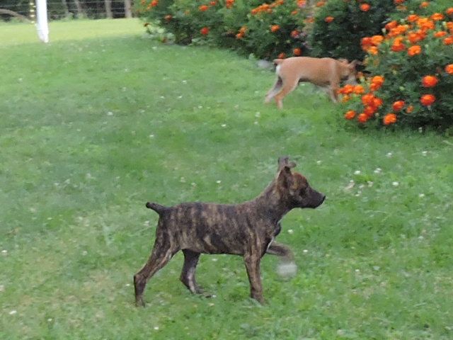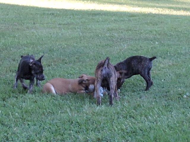 This dark brindle female is the one that almost died when she was a pup. She is now as big as the rest and beautiful I think. Pistol is in the Back ground. These pups are fun. I had them to the woods tonight. They can move and jump quick. Dave