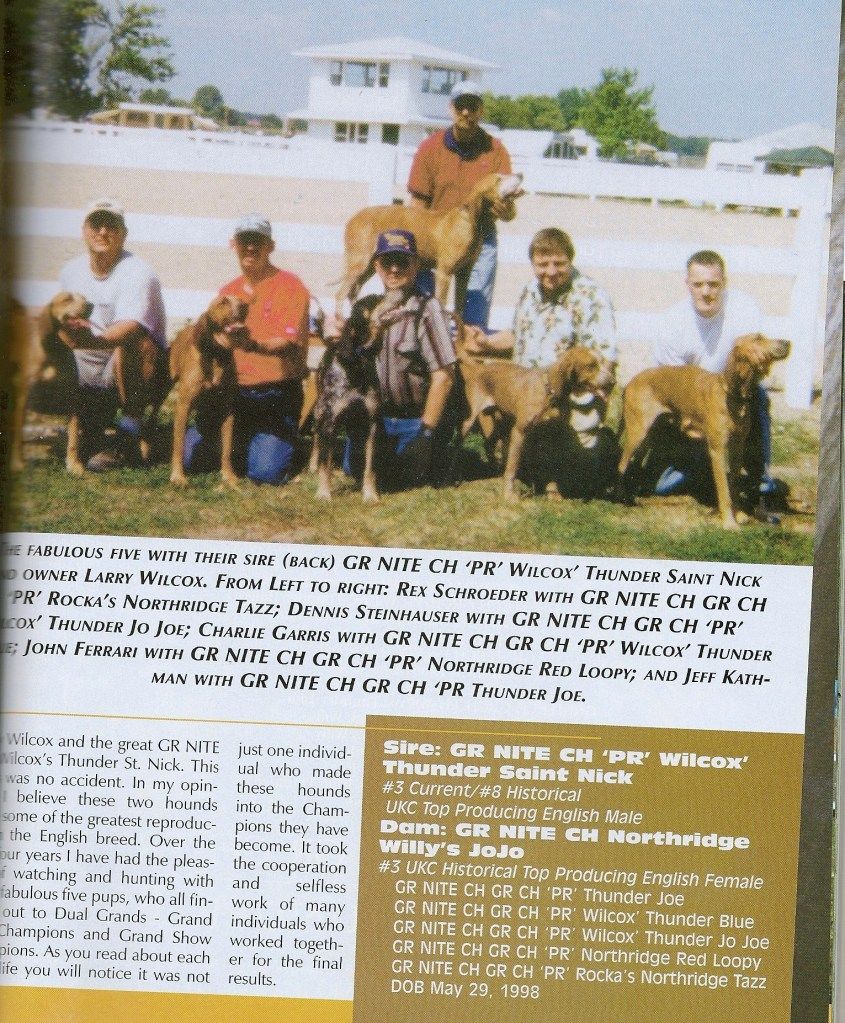 Former home of: 1995 AKC Overall World Champion Smith's Ohio Cindy 2005 Performance Program Highest English Money Winner of over $11,000 GrChGrNtCh Neuse River Big Money 2 Time English World Ch GrNtCh Wolfe Creek Diesel 2 Time W.V. PKC StateCh GRNtCh Wolfe's Big Man GrChGrNtCh Power Packin Pete GrChGrtCh Ringtail Ready GrNtCh Big Time Joe ChGrNtCh Twin Oaks Big Red Ben High Scoring English Thursday Night at UKC English Days NtCh Johnson's Jeffro High Scoring PKC Eng Female Sen Super Stakes Winning $2,000, 6th Place UKC Eng Days Reg Thursday, NtCh Johnson's Cry Baby 3rd Ohio State Championship Ch Johnson's Big Red Caboose 3rd Ky StateCh NtCh Locktite Tree Spike NtCh Ogden's Penny NtCh Luttrell's Kojak Woodstock Jawbone Woodstock White Grizzly Woodstock Cannon NtCh Sutton's Ringing Bell NtCh East Tennesee's Rolling Stone Ky State Ch High Scoring Female + High Scoring Ky Houndsmen Assoc Winner Hall's Jill PKC Ch UKC NtCh Hall's Rollen Pearl PKC SilverCh Winner of over $13,000 UKC Winter Classic Winner Texas Lonestar Top 4 (3) Yrs back to back GrChGrNtCh Jone's Bros Lumberjack GrNtCh Hall's Champ NtCh Smith's Jill GrChGrNtCh Big Red Turbo Train ***Pups/Young Dogs*** Wade Hall ***