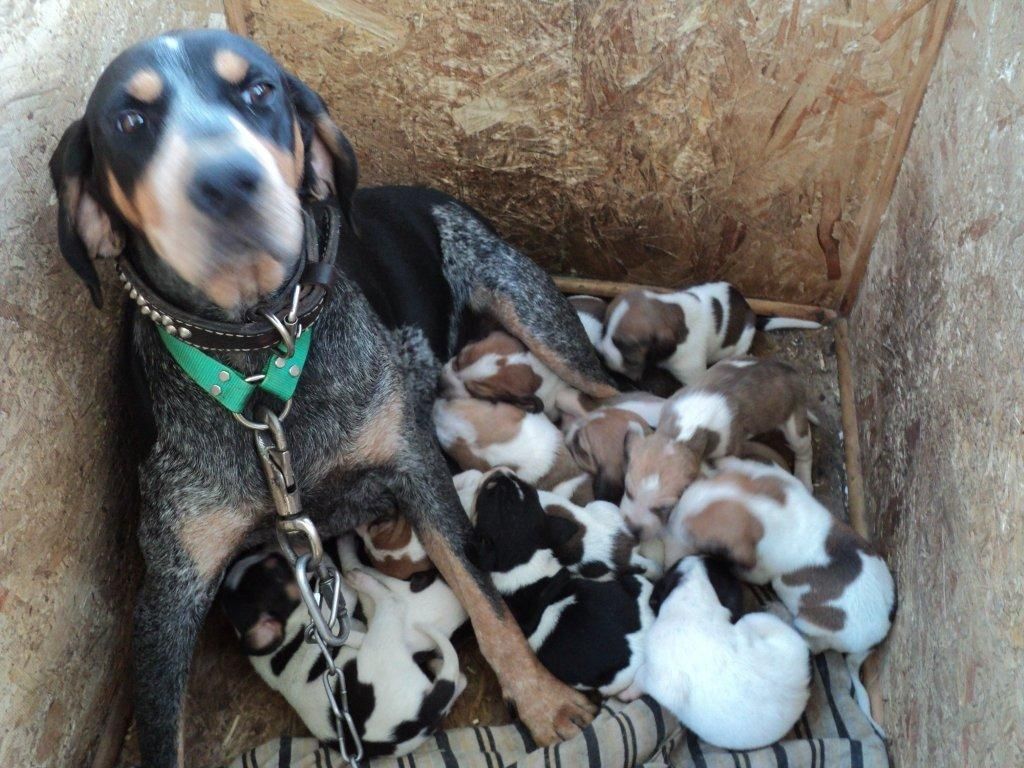 Sadie got lost in the shuffle her. I quit hunting the hunts because the fire was not there for me. However Sadie is one of the nicest dogs I have had here. She has a very good mouth, excellent strike dog and a stay put tree dog. Her mom is Nt Ch Timber Valley Annie who is a littermate to Gr Nt Ch Adkins Nt Thunder and Gr Nt Ch Wilcox All Grand Dan. She had around ten pups this morning. Thanks to Mike Rollings for hunting her and as always one of my best friends Larry Wilcox for his help. We will have pictures in the next few days.