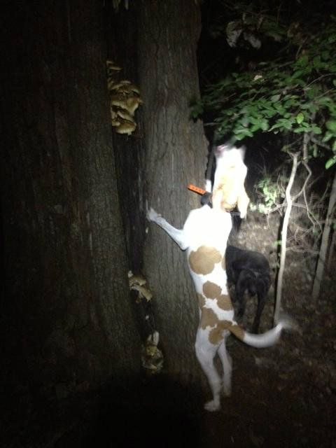 Took some pictures the other night of his first split tree he was slick but he made a good effort and treed real nice on it. He has a very loud mouth and a head full of sense!! He is very very smart, natural on the lead and load and comes when called.
