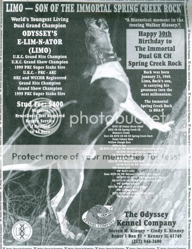 A dog that was heavily promoted and advertised 15 years ago and reproduced a good number of offspring was a hound known as Gr. Nite Ch. Hardwood Dan. Ole Dan was one of the best when it came to treeing coon, so good good he won the Purina Award twice with stiff competition when it was a cut throat game. Dan never reproduced his likeness.