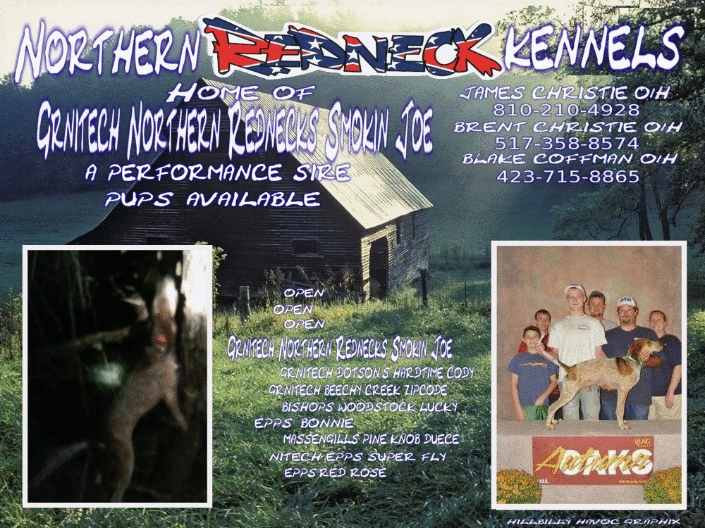 Grnitech"Northern Rednecks Smokin Joe"(frozen semen)2011-2012 ,2014 Performance Sire( ACHA Grnitech)(grand 16 finalist 2011 at A.O.)(ACHA MI. State champion2012)(High scoring dog and 1st place Grnitech Saturday night at English days 2012)(2 cast wins and High scoring English at 2012 Plott Days)(Qualified for the world 2012)( 1st place Grnitech and 2nd place over all at the Georgia state hall of fame hunt 2012)(Qualified for the world 2013)