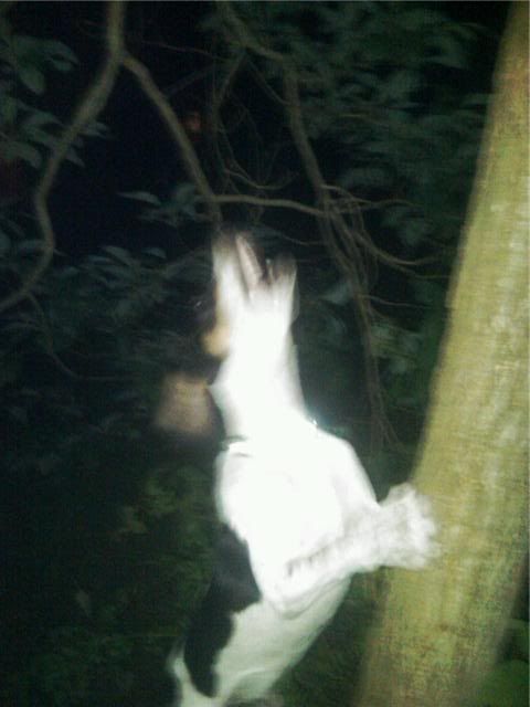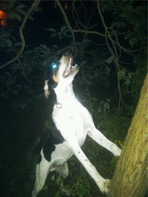 Here's Junior on his first wild coon at night. Split from the old dogs and had a kitten up a little tree. 7 months old and already likes to be by himself. I like what I'm seeing!