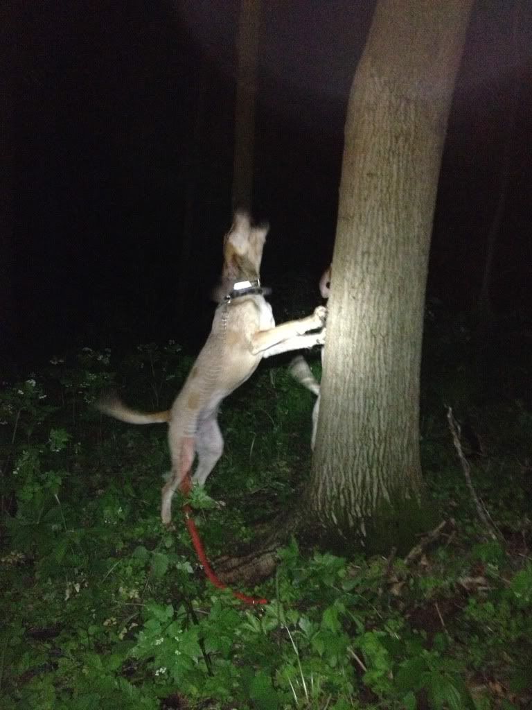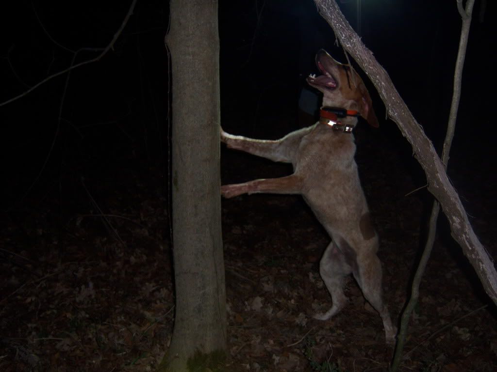 Just updating you on my Gun pup. Getting him off on the right foot after the rough start he had, still fighting the eye infection almost cleared up. Showed him his first coon in a roll cage he bayed it good, stayed with the other pups and at the tree. Shot it out he wooled it and treed the hang up intensly! Not too bad the first coon we call him Gun's Blue Goose!