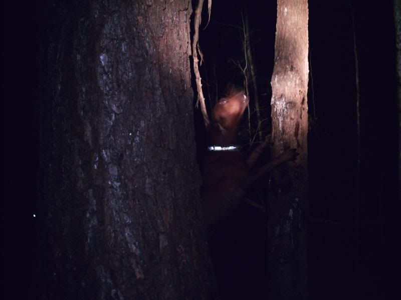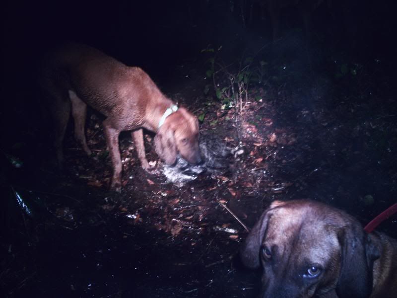 I HAD TO RETRIEVE ONE LAST FEEDER, SO I WALKED 'EM THROUGH DA JUNGLE, AND CUT ELLIE LOOSE ON THE FEEDER.(QUEEN WAS ALREADY OFF THE LEASH). TEN MINUTES OR SO LATER, ELLIE OPENS. QUEEN WAS GONE BUT I NEVER HEARD HER. ELLIE WORKED THE TRACK FOR 20 OR 30 MINUTES AND SOUNDED AS THOUGH SHE TREED. ON THE WAY TO THE TREE, QUEEN, WHO HAD CHECKED IN, MADE SEVERAL TREE BARKS ON A TREE. ELLIE HUSHED AND SO DID QUEEN. I WAS CLOSE TO QUEEN WHEN SHE BARKED UP, SO I SHINED THE TREE AND WENT ON IN THE DIRECTION ELLIE WAS TREED. SHE CAME BY ME AND KEPT GOING BUT NEVER WENT BACK TO THE TREE. ON THE WAY BACK OUT, QUEEN MADE A COUPLE OF TREE BARKS ON TWO TREES THAT I DIDN'T SEE ANYTHING IN. AFTER GETTING BACK TO THE FEEDER, WHILE I WAS TAKING UP FEEDER, QUEEN LOCATED AND HAMMERED FOR 'BOUT THREE MINUTES AND QUIT. AFTER NOT HEARING ANYTHING FOR A COUPLE OF MINUTES, I CALLED BOTH IN AND WENT TO THE TRUCK. THOUGHT 'BOUT TURNING BACK LOOSE, BUT KNOWING I HAD TO LEAVE THE PISTOL AT THE TRUCK DEPRESSED ME SO MUCH THAT I JUST CALLED IT QUITS.(FOR THE NIGHT, THAT IS).