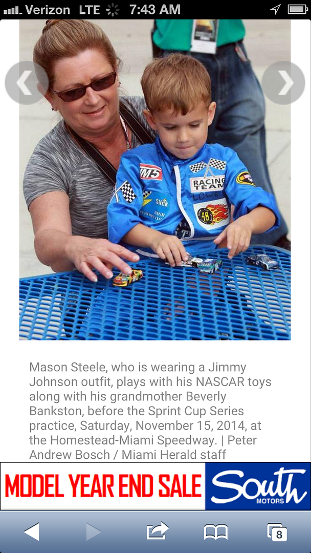 Get ready guys and gals, a new Nascar season is upon us!! This is a picture of the January issue of Nascar Illustrated and Mason and I made it in the magazine from our Miami trip to the Championship race in November. We were the only fan picture they put in the coverage for that race and I'm a proud Paw Paw that one day, maybe 30 years from now, Mason can pull out his copy of the magazine and know that he was there. They are practicing today for tomorrow nights race and speeds are hitting 200mph so the reduction in horsepower didn't affect the speeds. Glad to see that. Looking forward to a great season and Jimmie winning his 7th championship! Buckle up and ride along with us this year!