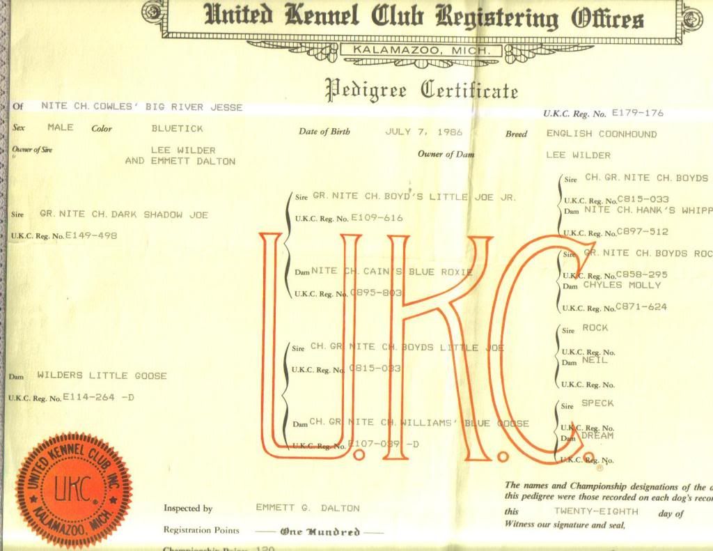 1992 World Nt. Ch. Gr. Nt. Ch. Cowles' Big River Jesse
