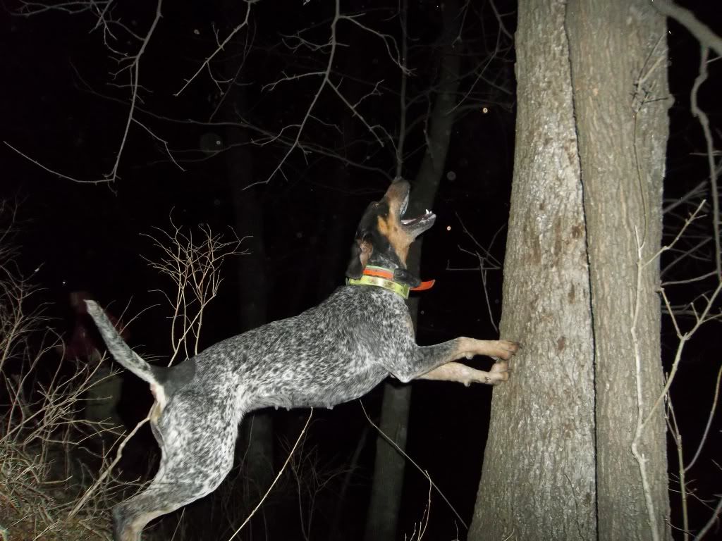 Lieutenant treed a coon the first time in the woods and was alone and every other time but twice that I have taken him. He got a late start but huge voice. I hope to have him singled registered as he is 1/2 Walker.