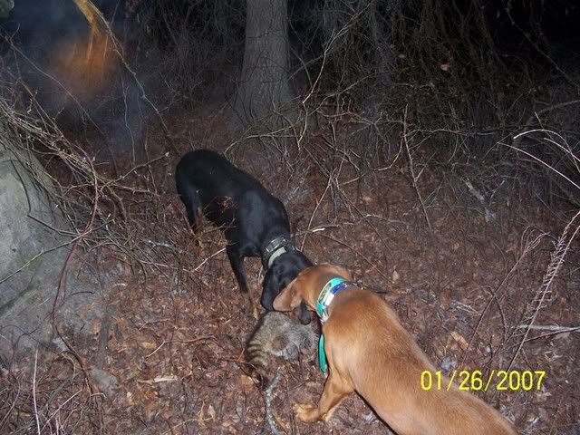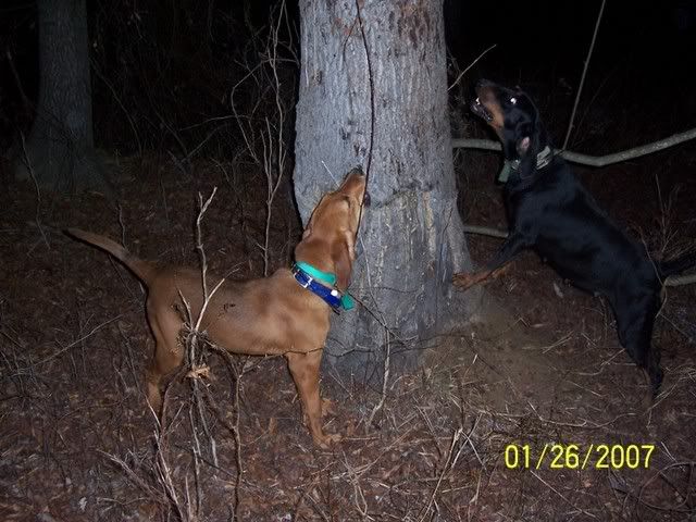 Took Sugar and a friends Redbone pup for a drop tonight. Sugar struck track and ran the coon for about 100 yards before treeing. The pup wasnt ready to get in on the chase which was good since she went across a major hwy. Sugar is bred to Croketts BLK Nute and should have pups in late Feb.