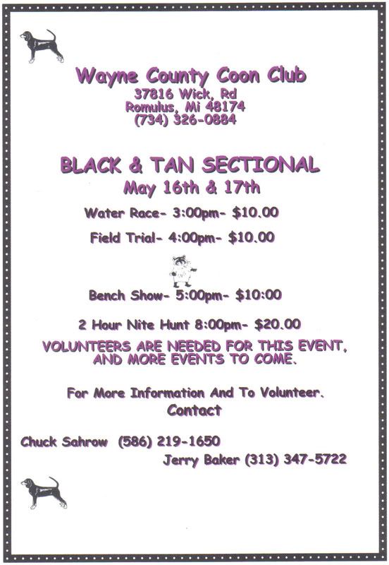 For those of you that attended The Redbone Sectional, I do want to say Thank You, We diffentley had a great turn out and a great time. The Wayne County Coon Club would like to have you all back, Plus more. We've Been working real hard this year & for years to come, To make things happen for this club, And the Results from The Redbone Sectional which was are First Event for this year diffentely what a turn out, So here we are again The Black & Tan Sectional which will be are second event, Hopefully looking for a great turn out.