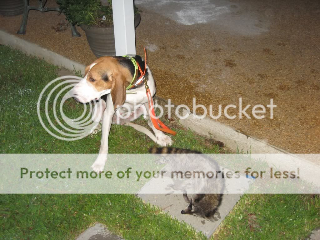 Tonight I decided to take my young female out hunting. Went to my first turn out and there was deer laying about 30 yards from me and I had no shock collar to put on her, so i drove about 200 yards and cut her loose she hunted around for about twenty minutes then came back. I tried to get her to hunt some more but it just was not happening (her tongue was dragging the ground) so i put her in the truck and we went back home to the city.... and when I got her out of the truck she would not stop pulling all the way to the pen then started making laps around the pen with her nose in the air.... I go get the light and sure enpugh two coons perched in a tree 20 feet from the pen so I got her out and she went right to the tree so I leashed her and went ang got the pellet gun and shot one out for her... snd the fight was on. This was the most fired up I have ever seen this dog over a coon so I hope our next hunt goes well.