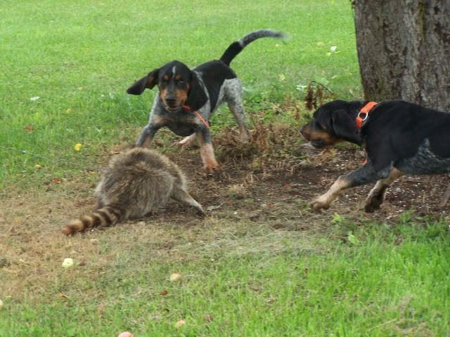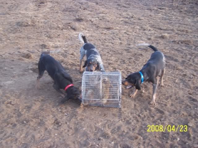 I think my first two are out of Jesse. Cooter the dark pup is off the female killed by the car. He is one gritty fool who loves to pull fur. Sure is a great line of blues and John still calls to see how the dogs are doing. Bell and Blue where treeing coon on there own at 5 months and pulling fur on the younger ones. They are in the one pic at 5 months old with the coon.