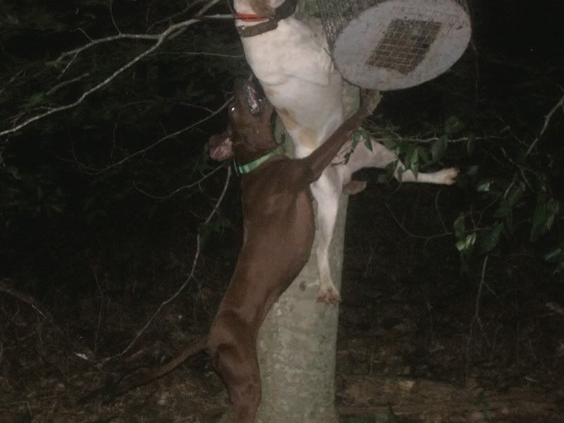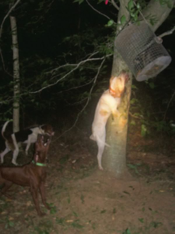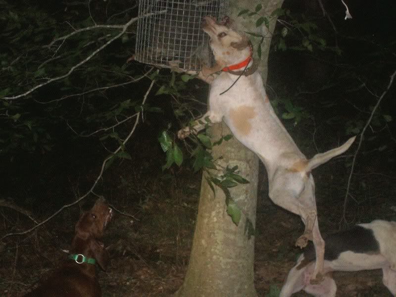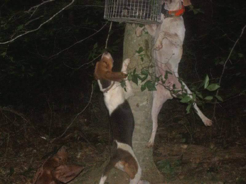 Well, we're working a young walker female this week. Started her on a caged coon on the ground a few days ago. Last night drug the coon through the woods a ways and hung it up. Released her with our Magic (redbone) and Gunner (english male) the first time. Found it right off, did great.