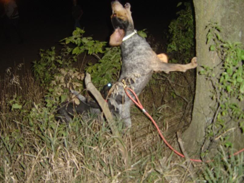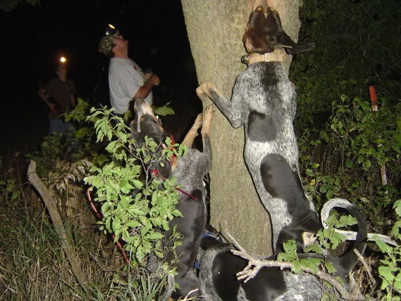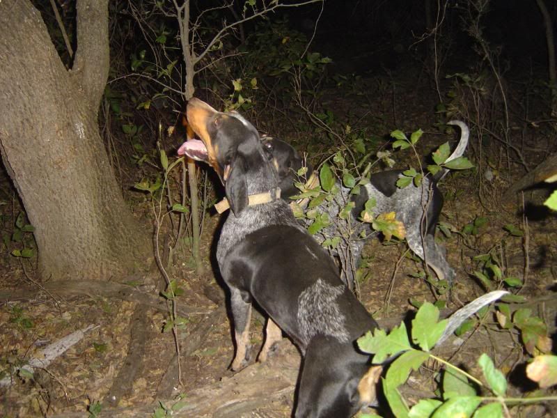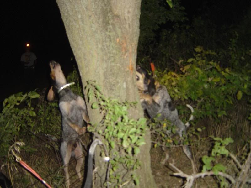 allright folks, see the way both those coondogs are standing on the tree looking straight up that tree treeing? thats the way a dog is SUPPOSED TO DO IT. Nice pictures John.