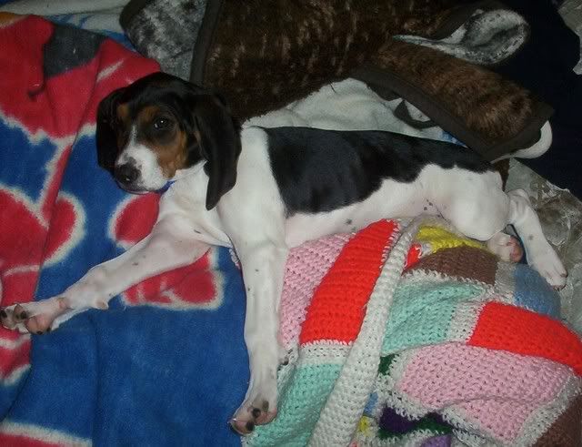 We just got a new pup, she's 10 weeks old and loves the couch right by the woodstove..... she is so cute. We always keep our pups in side untill at least 6-7 months, which is also when we start showing them coon.