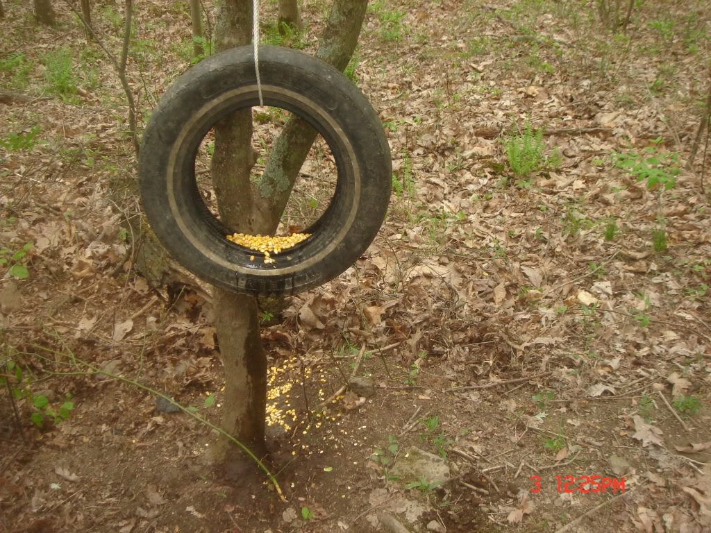 we use a 12-14 inch tire and then use a drill with one of them there hole cutter thingys that are 2" in Diameter. sometimes a knife. put corn in it but leave enough room to put water over it! if u dont u will have squirrel problems. and ifn u want them to have a little bit of a slow start...put yeast in there and cover it up for about a week then uncover it! HAHAHAHA!!!!