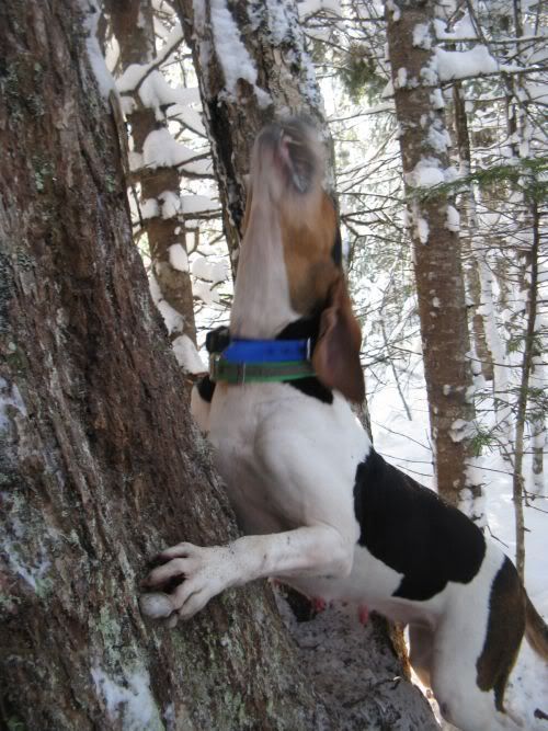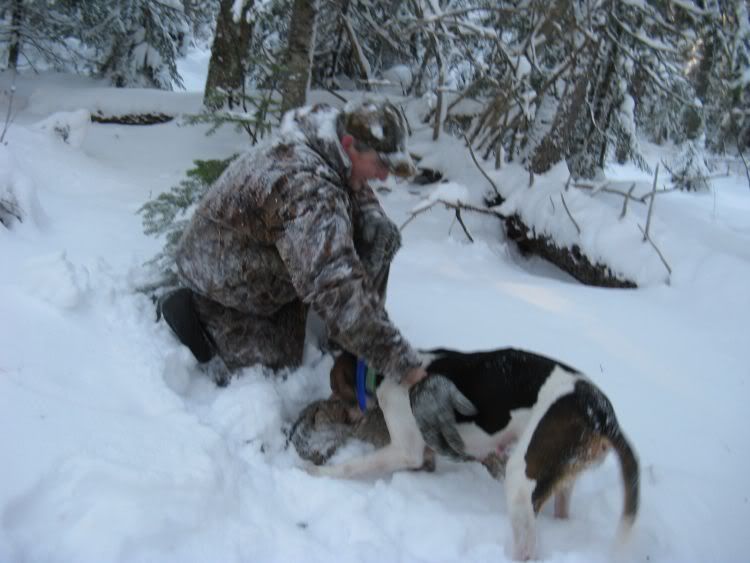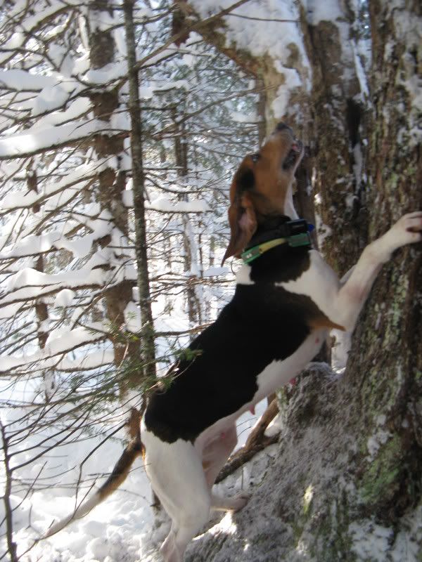 Last week we got a bunch of snow so no more coon hunting for a while. We went over to our camp a few hours away to go cat hunting. We found an old track and my dog treed it after 4 hours of running. Here's some pics...