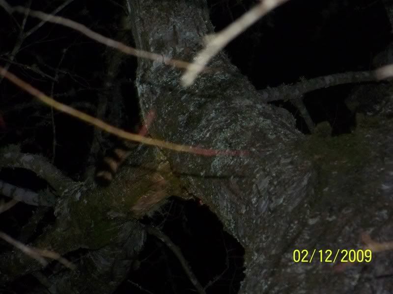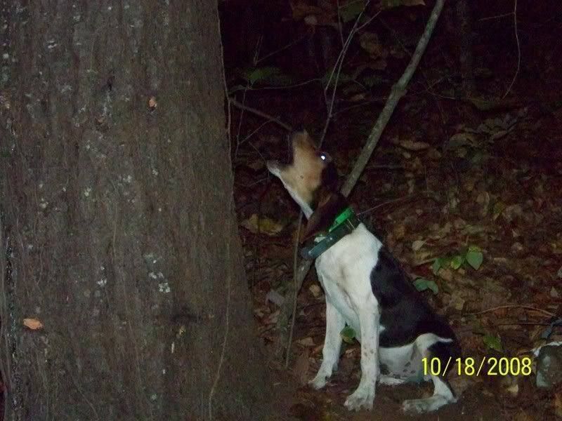 NOW GRANTED, THIS IS JUST A HANG UP COON, BUT HE TRAILED IT UP, AND TREED ON IT SOLEY BY SCENT, BECAUSE WE KEPT OUR LIGHTS OFF TO SEE WHAT HE'D DO. GRANTED HE'D WHINE AND COME TO US AND GO BACK, BUT WHEN HE FIGURED OUT WE WERENT HELPING HIM, HE FOUND IT.
