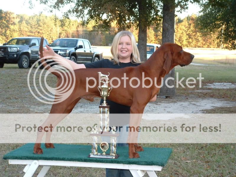 Andi brought Taylor home a nice Diamond Deluxe dog box as well as nice trophies. The redbone male is Rocket and yes he is outstanding. Taylor won her first "real" bench show with him last year at the AKC Ga State Championship. She won overall there with Rocket.