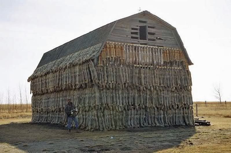 Cool pic but I would not want to be the one skinning all of them and then hanging them on the barn or taking them all down. LOL