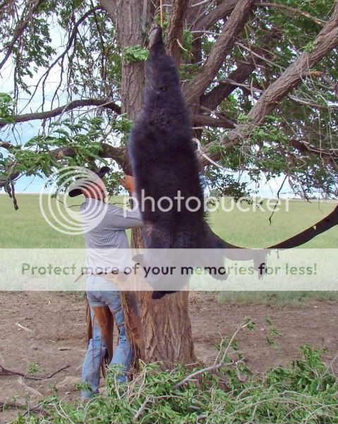A guy was out working cows when he looked over and saw a small bear watching them. As soon as he saw the bear he spurred his horse in that direction, and had his rope headed towards the bear. He somehow was able to do this before the bear or horse knew what was happening. Well with a lot of luck and a long rope he actually caught the bear perfect around the neck. Just as the rope got tight the bear stopped in his tracks. The horse wasn't able to stop quite so suddenly and ran on top of the bear. This caused the horse to start to jump around a little and the bear to take off. When the bear hit the end of the rope it kind of like a sling shot and fired the bear back at the horse. This was all the horse could handle and started to buck. The rider yelled to one of the other guys to heel the bear. So they could release him. Just as the second guy got a heel caught the bear reached back and pulled the rope off of his head. Knowing the bear would easily get the rope off his leg they let the heel rope go and went back to work. A little while later they saw a car out on the road. they went over to see what was going on. When the lady in the car told them there was a bear in the tree just out in the feild and it apeared to be hanging by it's foot. So they said they would go see what the deal was. Well the bear had gotten the rope tangled in the tree and was indeed hanging by his foot. so they climbed the tree and cut the rope to let him down. as soon as the bear hit the ground he ran under a nearby truck. after getting him out of there and on his way they finally got back to work.