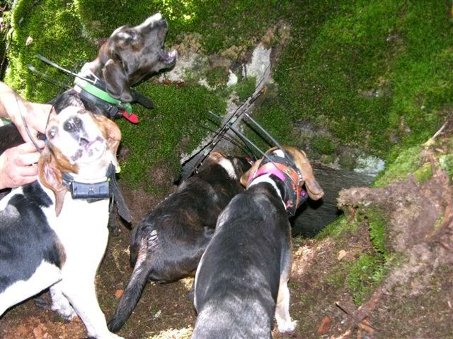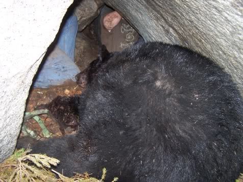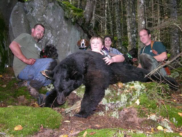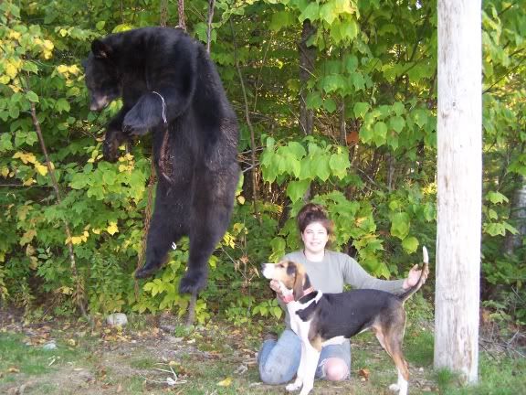 so last thursday we loaded up and headed to maine. we were invited to run some baits that were suppose to have some nice 300 lb bears on them. after checking the first bait bait and 2 dogs coldtrailing that the other 2 couldnt smell we picked up the older dogs and headed to another. got a good strike on the way and dumped on that, after an hour we dicided to pick up dogs as they were running a small bear and we were after a larger one. it was about 10:30 we checked the next bait. hoping to look on the camera and see what age track we had and what size bear.. we were not able to as the camera was ripped off the tree sometime after 1:00am. so.. the dogs are led in and are trailing out. cold trailing. we were able to listen for about a half hour then decided to drive around to another road. we had lost gps reading of the dogs. as we drove around and got back into range, the gps beeped and said the dogs had treed. i checked telemetry, as the mountain we were running on was full of rock and ledge, and half thinking the dogs were stuck. No tree switches.. hmmm... all 4 dogs were treed still on the gps. so we drove up a side road and got within 500 yards of the dogs.. couldnt say for sure that we herd them. we suggested that we head in and when we got there, to call back on the radio and let the others know what we had going on. about 200 yards from the dogs.. we heard them and knew they were looking at something in a HOLE. called back on the radio and told them to start heading in.. they were bayed in a rock cave. just as i put the radio back, i herd the bear blow and the dogs were going insane.. it was pretty exciting. so we leashed the dogs so none of them would get pulled in with the bear and waited for the rest of the crew. there was a small peep hole on the side that you could stick your head in and see the bear, that was where the shot would have to be taken. 11 yr old boy with his dads 357 stuck his head in the hole and pow. he killed himself a bear. took 4 mens might to pull the brute out of the hole, and took over 2 hours for 4 men to get him 500 yards back to the truck. he tipped the scale at 345 fully dressed ( guy at store told us scale was 15-20 lbs off) so not sure of actual weight. but he was big. all in all was a very adventurous day. here are a few pics. enjoy!
