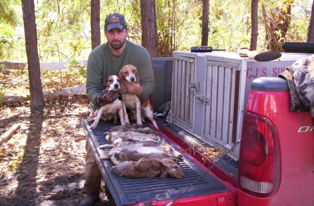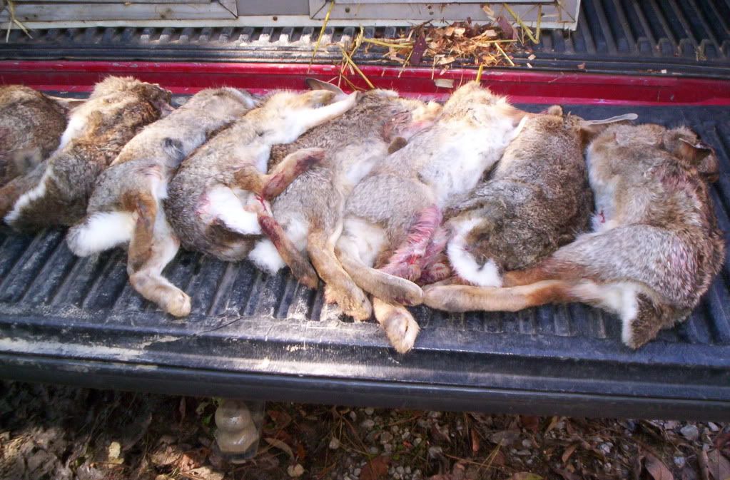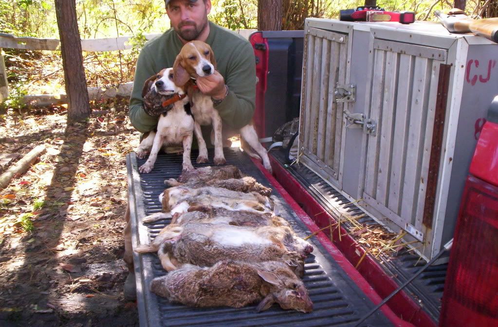 JUST THOUGHT I SHARE OUR HUNTING TRIP PICTURES ON HALLOWEEN. WE GOT THESE RABBITS ALL IN 4 HOURS OF RUNNING WE RAN ALOT MORE THEN WE SHOT . I HAD RABBITS RUNNING ALL OVER THE PLACE. WE HAVE GOT 22 RABBITS IN 2 WEEKS PICTURE WITH ME IS 2 OF MY FINES FEMALES THE LITTLE BLACK AND WHITE ONE IS CJ`S TOPNOTCH DIXIE DELITE SHE OUT OF HBCH CH SHAMROCK AND THE TRI COLOR FEMALE IS CJ`S SOUTHERN FOXY LADY OUT OF HBCH MOORE`S MISTER BUSTER BRANKO I GOT BOTH OF THESE FEMALES FROM JaKE AND LARRY MOORE THEY RAISE AND TRAIN THE BEST BEAGLES IN ARKANSAS THANKS JAKE AND LARRY MOORE . JIMMY LEACH