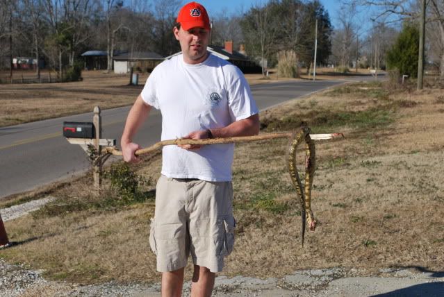 Attention al southern hunters: Today my wife and I were out walking with our baby and up the road from our house is a little creek. We usually like to walk down there and look around, and let the dogs play around in the water. As most of you know, these past two weeks the temps have been below freezing. Today the weather here in south Alabama was in the 60's. Well, laying in the sun down by the creek today we saw not one, but two huge water moccasins. I didn't have a gun with me so I was only able to kill one. It was 3 and 1/2 ft long and already aggressive. The other one slithered back into the bank. Last week thry were froze solid, today they are back! You northern hunters have got it made! Keep your eyes peeled!