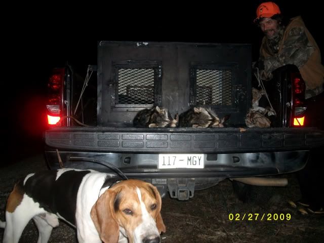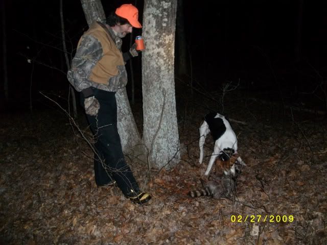The last night of the season ended great.Our buddy Larry at the Tenn, river had never been coon huntin and asked if we could bring Buck up...Larry has 2000 acres of untouched huntin ground and we just couldn't pass it up.So Saturday night at 8:30pm we turned him loose and off he went in the very hilly country.20 mins. had passed and no signs of Buck,and the hills killed the tracker.I finally got an ear on him,but just for a second.So we climbed a hill more like a mountain to me,and then once on top Buck rang out loud and clear.Now at this time something didn't sound right.Buck would sound close min. and then far the next,so we finally got to him and he was tree as hard as ever.Then he looked at me for a second and ran off about 70 yards and started treein again.I looked up the first tree and there she was a big sow.We left that tree and went to where he was treein the second tree and it was a big den tree.I got Buck and went to the first tree and let Larry shot that one out.No sooner the coon hit the ground and Buck shook it a few times he ran to the other tree.With a little shootin up in it and callin the coon came out on a limb at the top.I shot that one out to make two for the night..We talked a min. and thought we better stop while we were ahead...