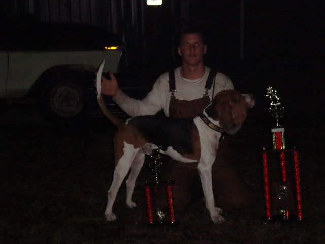 Well boys, we did it again! Tree Slammin' Harry II aka Peanut, got another Nite Champion win tonight with 575+. It's been raining here on and off all day. Went down to hunt club for UKC hunt, put ole Peanut in the bench show and won Champion Male, put him in the hunt, got by himself on the first drop and treed two more with 1st and 1st on both trees. Not to bad for a rainy NC night.And hes not even 2 yet.