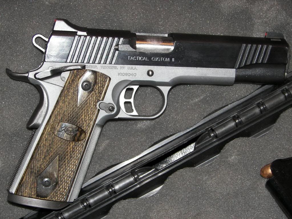 i have owned alot of different pistols and by far my fav is my kimber tactical custum II in 45. its a single stack which makes it easier the grip and is the most accurate and smooth shooting out all the semi autos i have shot. i hated the glock 45. just way to wide for me. sold in a month of having it.