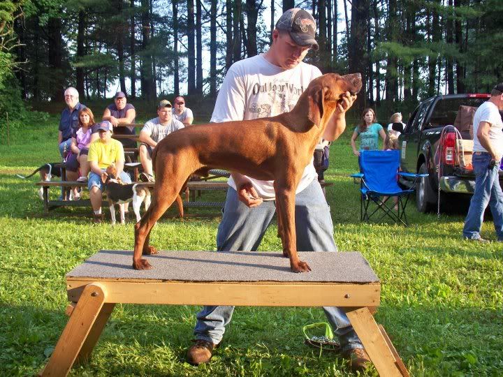 Juice (we've GOT to do something about this name!) is obviously bred to hunt, but we're hoping to show him as well. His weakness is his front feet, which I'm hoping some excercise, good diet, and a little age will improve.