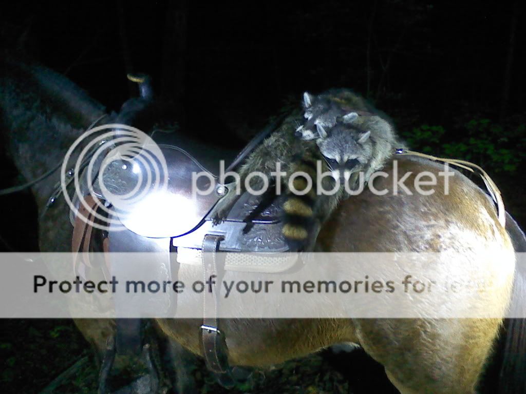 3 nice coons last night, 1 was 19lb 3oz, 17lb 9oz, the other one was smaller. Got Ray Conrad (AKA) Brighteyes man hooked! Ray came up last week to hunt on mules, and he loved it. He said man, sure can hunt a dog down like this. So needless to say Ray owns a mules now, and this is a picture of his mule! We had another great hunt last night! (NICK)