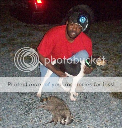 Ok wed night I took them out around 11pm and I sent GD on and the pup was just doing his normal thing being"stupid"I never heard GD open but once I got to the top of the hill I could hear him down on the low side treed well he was bout 175 yrds from us and as we got closer Ol Blaster started stopping and listening and took off like always towards GD(I always say to myself lol he's going to be the greatest me too dog ever!!!)Anyway I get into GD tree(saw the eyes before I got there) and Blaster no where in sight so I tie off GD and start looking around,I wasn't nervous cause he couldn't have went to far so I didn't call him(I was about to at first)I just said lets see what he doing and then he went to barking down on the creek bed about 30 yrds away!!!I went towards him and when I got there he met me off the tree flipping and twisting around"acting stupid"but went back to treeing on the tree.I shined up and he had him!!!Ok I was like what do I do now lol so I decided to let GD loose and let him tree cause I only had one lead,so I tied Blasta back and shot the coon out,went and made sure he was about gone and turn Blasta loose on him it took a sec for him to find him but he did and started playing wit it.I got down on my knee and petted the hair off him,then I started just tossing it around play wit him for 10 min or so(poor Gd LOL),I then went to GD tree and petted him up nice and headed out,got back and woke everybody up and told them to get the camera.