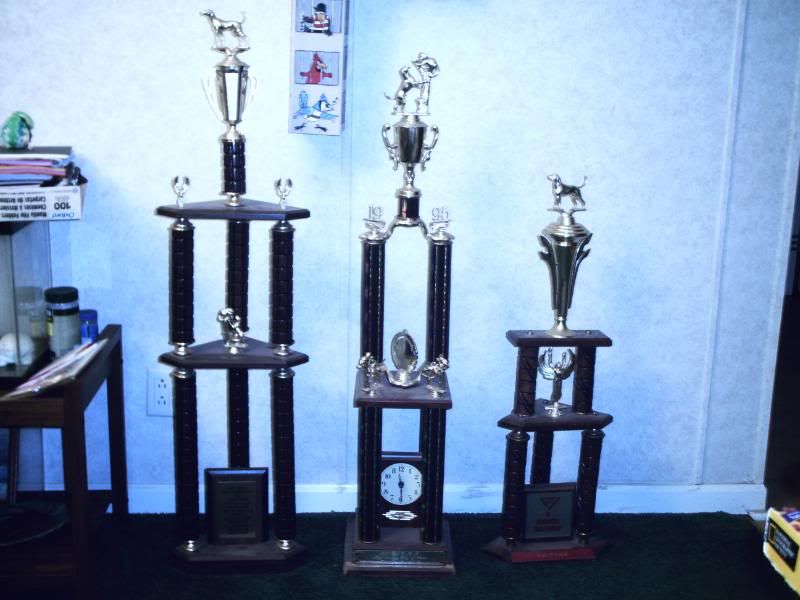 I GOT THESE 3 BIG THROPHIES. I FIGURE THE BIGGEST FOR HIGH SCORING DOG, THE NEXT BIGGEST FOR OVERALL SHOW, AND THE OTHER FOR OVERALL WATER RACE WINNER. I'LL CHECK AND SEE IF I HAVE SOME OTHERS FOR THE SHOW AND WATER RACE. THE GRANDS USUALLY TAKE THEM HOME WHEN THEIR DOGS GET SOMETHING.