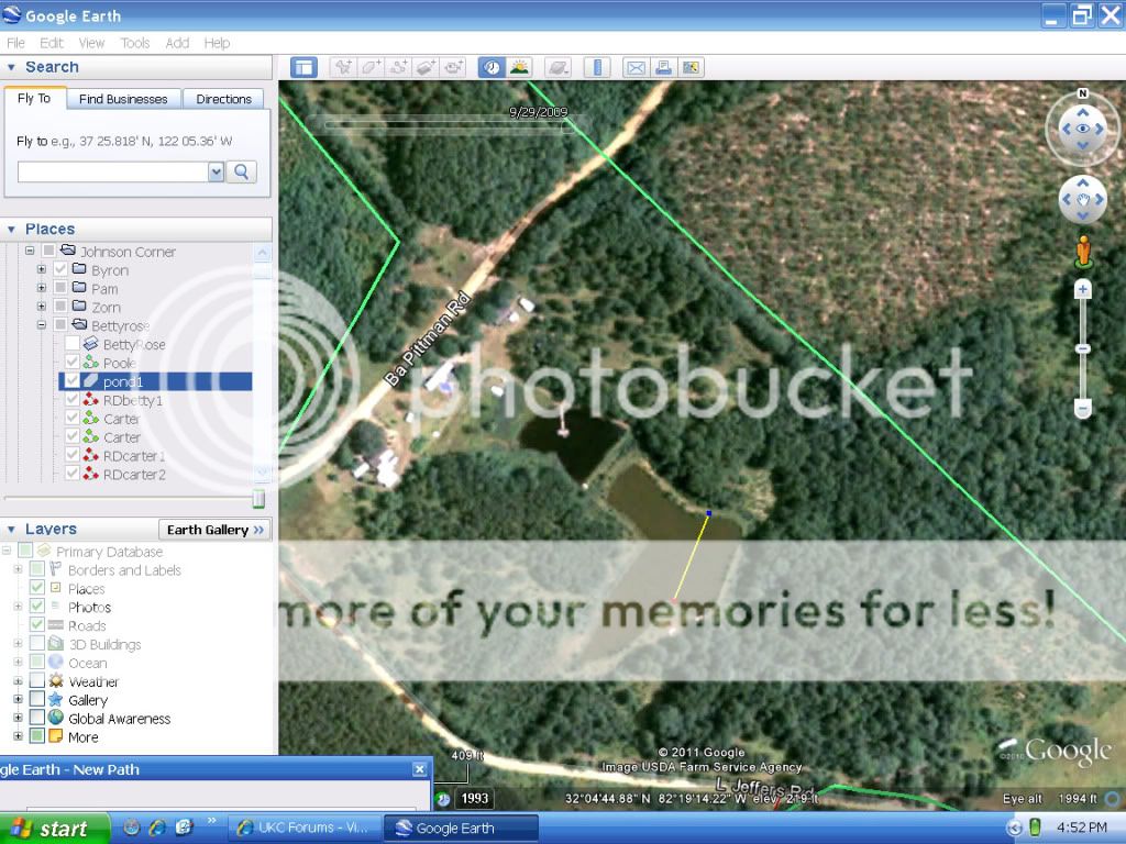 I put the yellow line on this google earth picture, which is where the dogs will swim. Its about 60 feet from the dam and the dogs will swim about 280 feet. The pond is clean. No stumps and kinda deep drops off fast. Its a good set up.