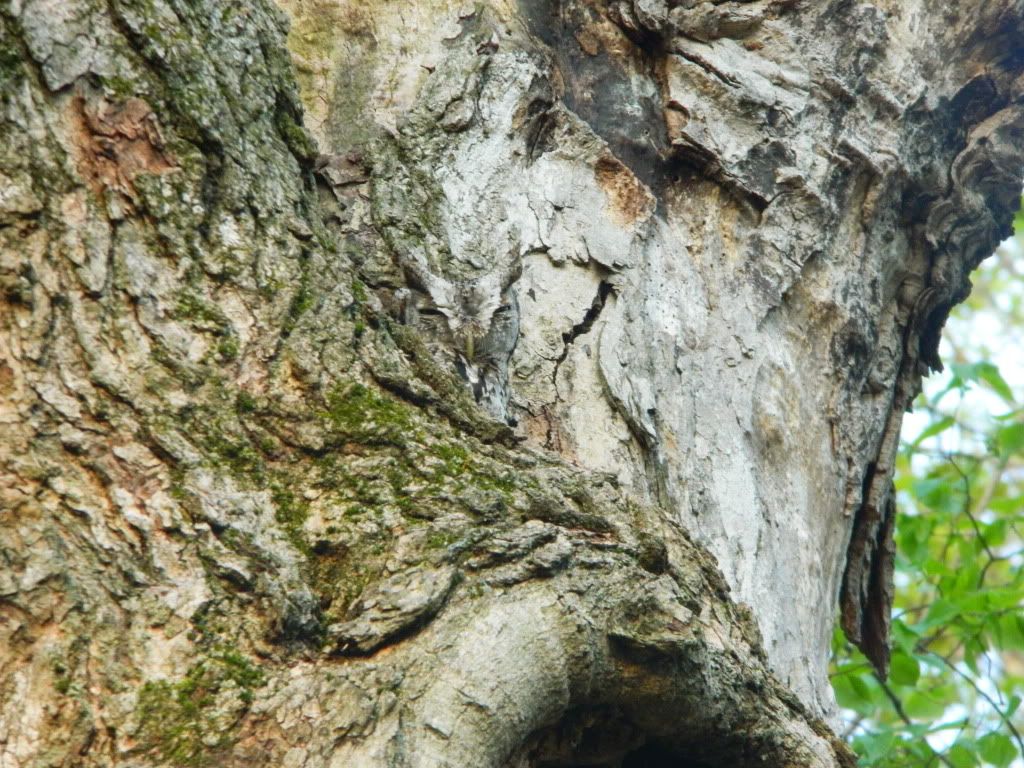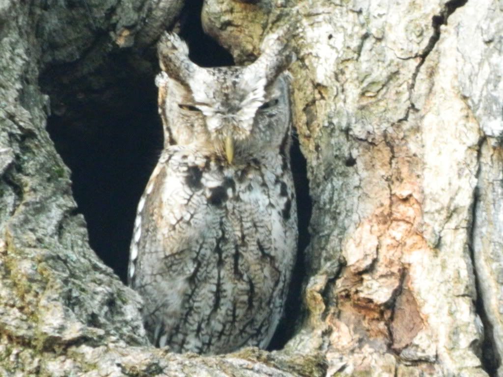 Now I see the owl. I was looking in the fork of the tree and I thought I was looking at the head, nose, and right front leg of a grey squirrel peaking over the fork from the back side.