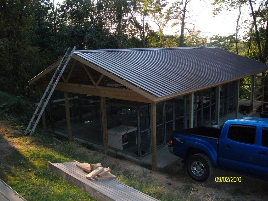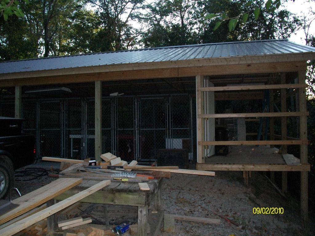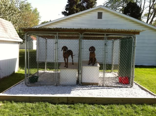 here is a picture of my kennel i built. it is 24x40 i closed in eight feet of it for my hunting stuff and keep it heated. the dog runs are 5x20 long. when it gets cold i close in the back.