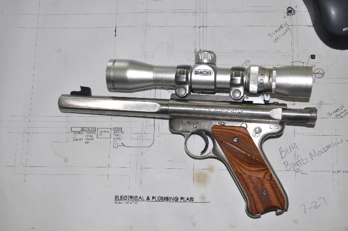 Ruger Mark 2 with 10 inch bull barrel. Deadly accurate and will reach the highest tree.