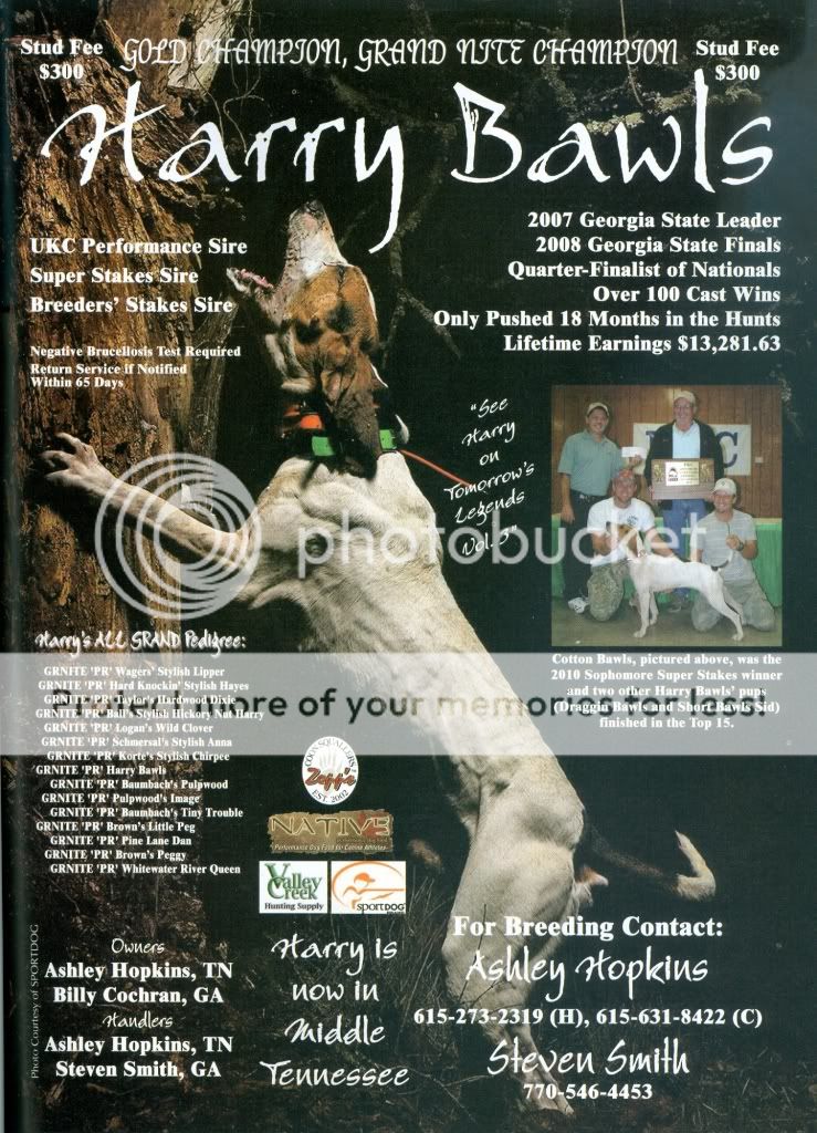 Im hunting one right now named "Steel Bawls". He is owned by Jeff Ricklefs and William Cochran (owns harry bawls). He is a pretty nice 1 year old. Good track dog, he bogs down from time to time but he will finish it. Good mouth, you can hear him treed a long way! And he's as big of a hunting dog as I've had in awhile. He fires off like a rocket and goes as far as it takes to get hooked. He's not gonna come back, period. He's got all the tools to be a nice hound.