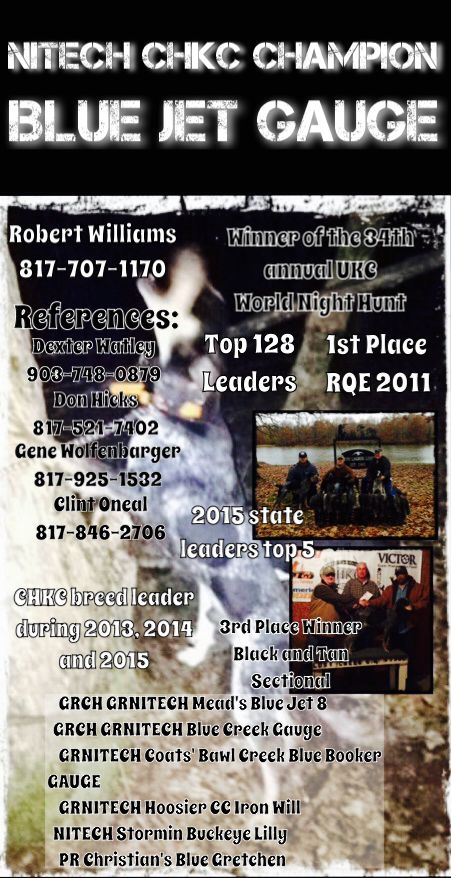 UKC Forums : Powered by vBulletin version 2.3.0 UKC Forums > UKC Free Classifieds > Coonhound Classifieds > Blueticks: Stud Dog and Kennel Promotion > NITECH CHKC Champion Blue Jet Gauge