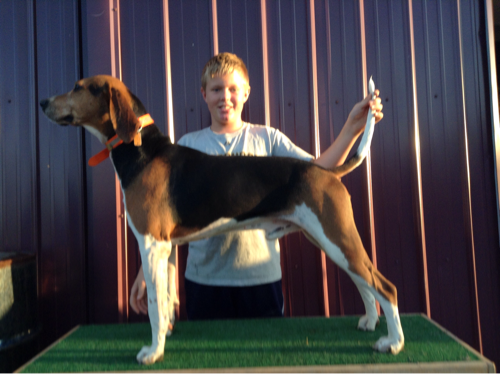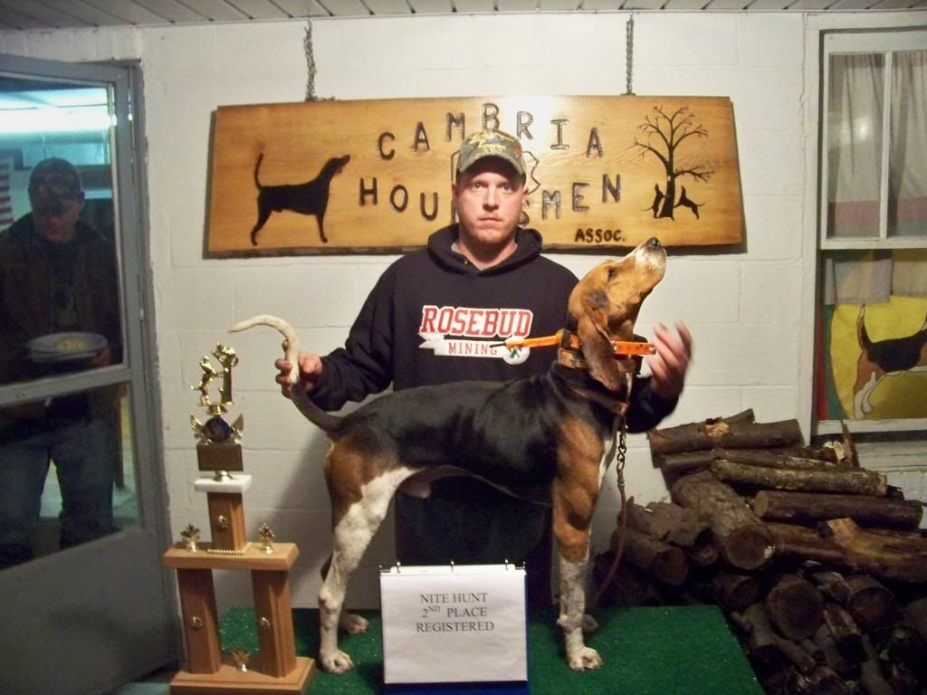 I have owned Champ since he was a pup, he was a natural starter at a very young age. He was treeing coons at the age of 12 months old. He doesn't have a mean hair on him. In fact if he gets a mean dog in the cast it is very obvious...he will split off and hunt alone every drop. He has a very loud clear mouth that drowns the other dogs out. He hasnt bred any females yet but I am ready to stud him out and work on finishing him out to 4 way Grand.