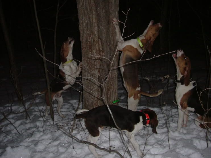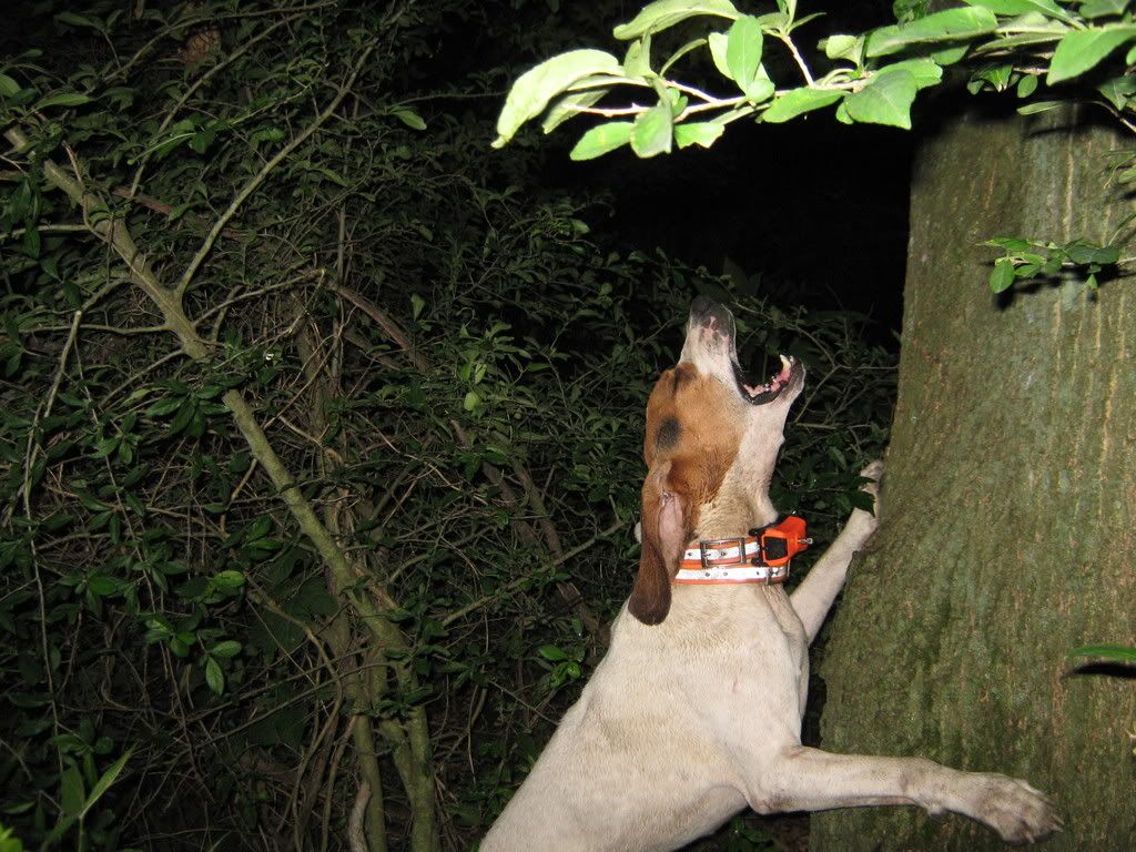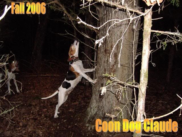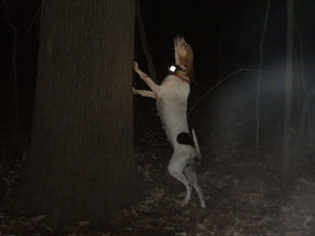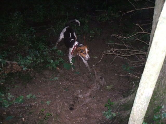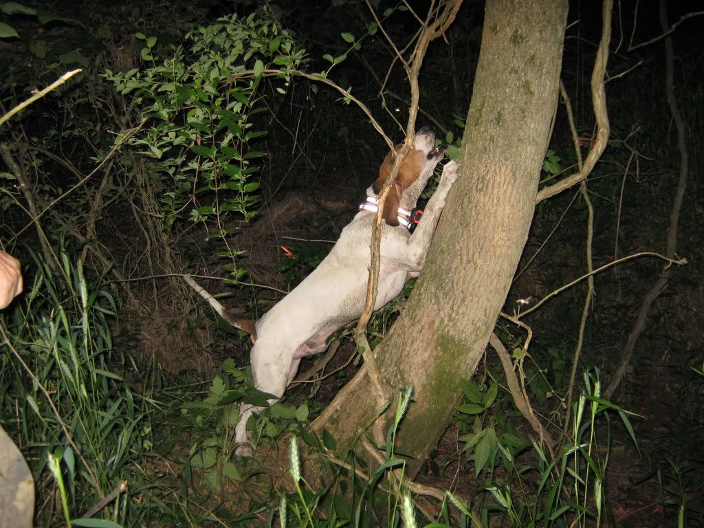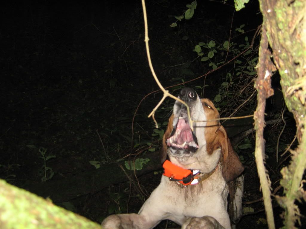 Here is a pup out of Claude and Cherokee River Little Joe after she treed here first coon by herself.