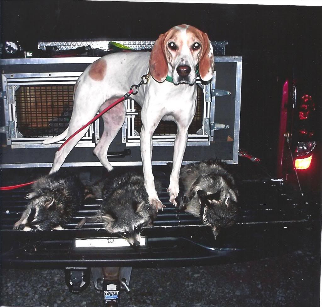 I HAVE BEEN ASK HOW GOOD WAS SHE. NOW RETIRED JESS WAS ONE OF THE BEST COON HOUNDS I HAVE HUNTED. SHE HAD SUPER FAST GREY HOUND SPEED ON TRACK,SO FAST THAT SHE RAN AWAY FROM MOST DOGS.
