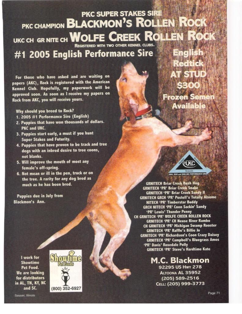I have a dog off Rollen Rock, Alsome, Snake, coon crazy daisey,coon sacking Sandy, he's 9 years old, and still going strong, real nice dog, great track and tree dog.