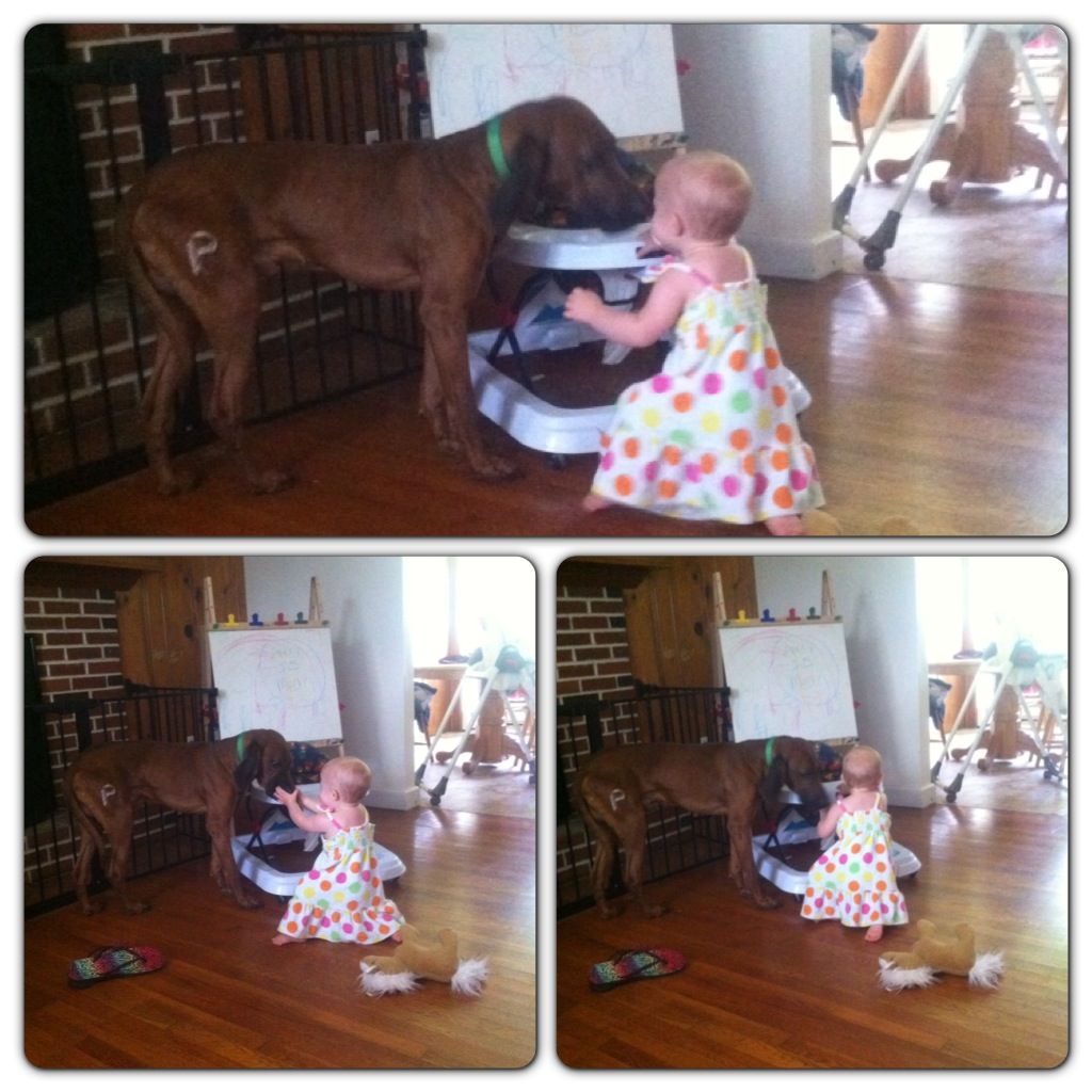 My daughter Addison at a year old with my old bandit dog hes long gone now but she always asks me about me him he used to come inside with the wife and kids on real hot summer days