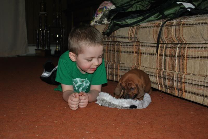 Would love to see pics of kids and their redbones. I got a baby girl almost 7 months old who loves dogs just smiles when they come around her. I cant wait to take he out with me. Tried to get my wife to let me use one of those carriers with the back pack straps and she said no haha. She isnt from a hunting family and is a little worried how early im going to try and take her with me.