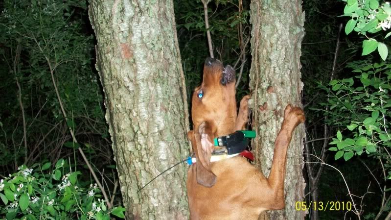 Tater was raised and trained here for his first 2 years. He treed his first wild coon at 5 1/2 months old. Holding pressure at 6 months. Singled him out at about 8 months. He had a nice steady progresion to him. He'd hunt out as far as needed. Cold to med. nosed. Bawl on track. bawl/chop on tree. Never burned any trash. When he locates, you can tree him.