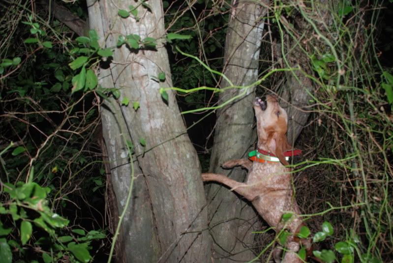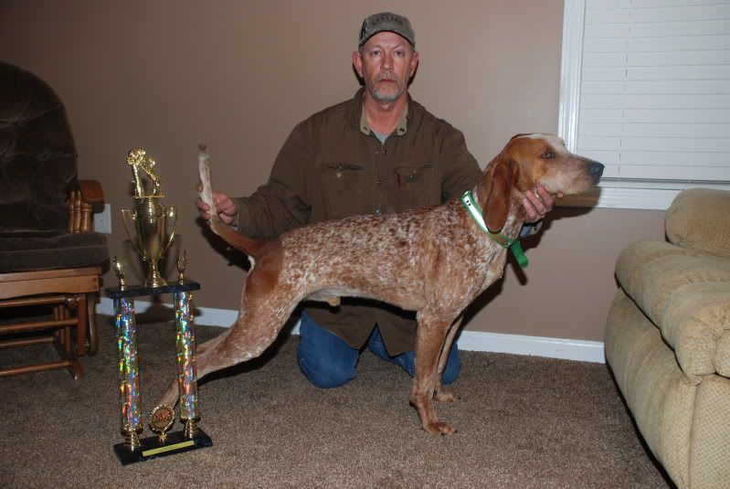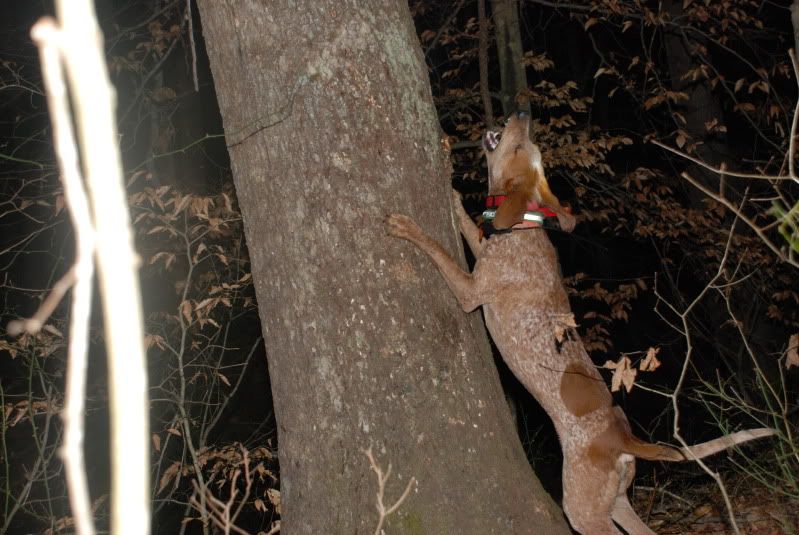 Here are the answers to a few questions about Shaker. He is a first and first hound in a lot of company. Hunts alone or in company. Very open track dog and a good steady tree dog. He is chop both ways but on occasions will throw a bawl in on the ground. He is a very cold nosed hound and will put a end to his tracks. One of the most accurate dogs I myself have ever hunted with and I've hunted with several. He is a loud dog and can be heard a long way on track or tree. He will hold pressure. He is real good if other dogs pull up short he moves on and gets the coon treed right. He is broke to come when toned but can be called in too most times. He has a head full of sense and will follow you out when you are ready to go. Goes to and from chain to truck no leash needed. Trees better in cold weather than the dead of summer. He will chew on a vine or bush if one on or beside the tree but two minutes has never caught him even if on tree by himself. Once you get to the tree he usually gets quiet and listens for meat to hit the ground. He is a good meat dog and a good kill dog. I have described him honestly and he will be this way. If I had to fault him anywhere it would be on the amount of mouth he gives on track and the fact that he will chew some at the tree. If you have any other questions feel free to ask.